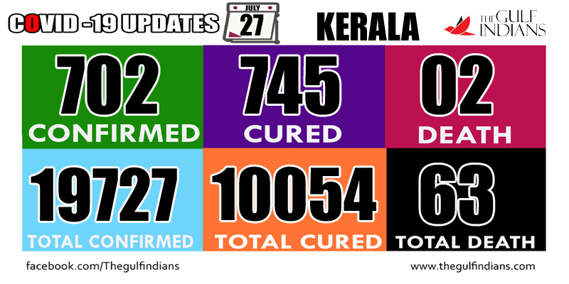 Seven hundred and two new COVID-19 cases were confirmed in Kerala on July 27 even as 745 patients under treatment have recovered from the disease. Sharing the details, Chief Minister Pinarayi Vijayan said, 483 are cases of infection through contact and the source of infection in 35 cases is unknown. 75 of the cases detected today are people who came back from foreign countries and 91 from other states. 43 healthcare workers were also infected The total number of COVID cases confirmed in the State so far is 19,727.