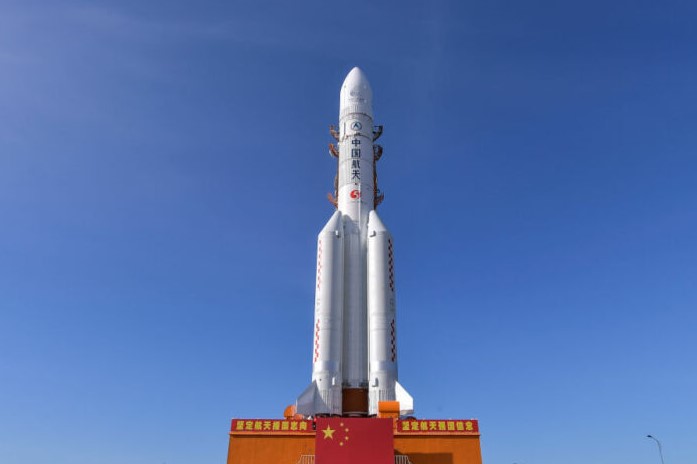 This photo taken on July 17, 2020 shows a Long March 5 rocket being transferred before a planned launch in Wenchang in China's southern Hainan province. - After sending humans into orbit and landing a probe on the Moon, China is aiming for another milestone in its space ambitions with the launch of a Mars rover between July 20 and 25. (Photo by STR / AFP) / China OUT (Photo by STR/AFP via Getty Images)