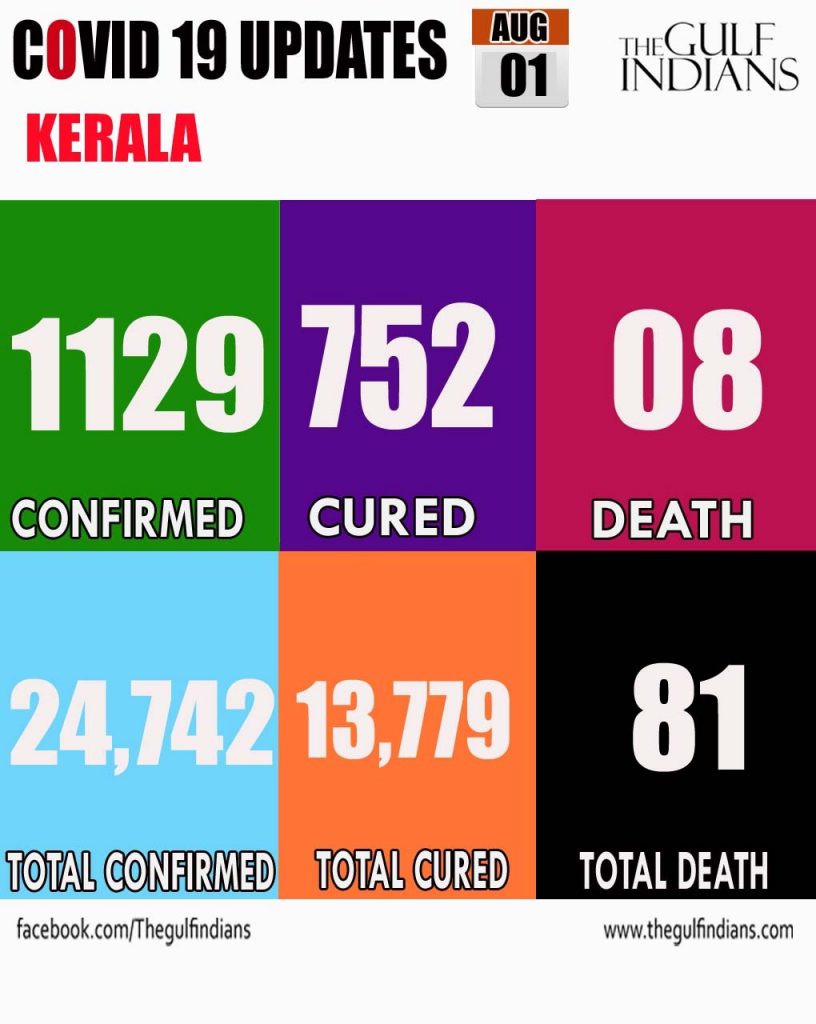 On August 1, 1,129 people were confirmed with COVID-19. Of this 259 were from Thiruvananthapuram district, 153 from Kasaragod district, 141 from Malappuram district, 95 from Kozhikode district, 85 from Pathanamthitta district, 76 from Thrissur district, 67 from Alappuzha district 59 in Ernakulam district, 47 each in Kottayan and Palakkad districts, 46 from Wayanad district, 35 from Kollam district, 14 from Idukki district and five from Kannur district.