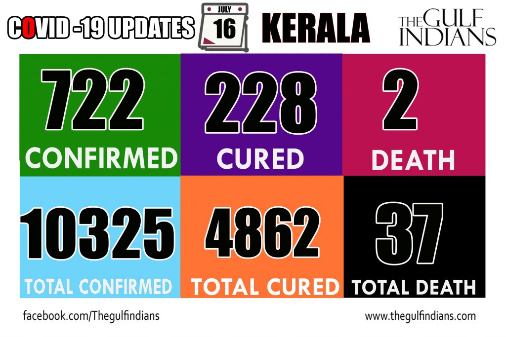 On July 16, a record 722 people were confirmed with COVID-19 with the total number of patients at 10,257. A total of 481 people contracted the infection through contact. There are 34 patients with no known source of contact, Chief Minsiter Pinarayi Vijayan said. The Chief Minister condoled the deaths of B Aneesh, a 39-year-old from Thrissur district who had returned from Chennai and 25-year-old Mohammed Saleek from Kannur district who had arrived from Ahmadabad.