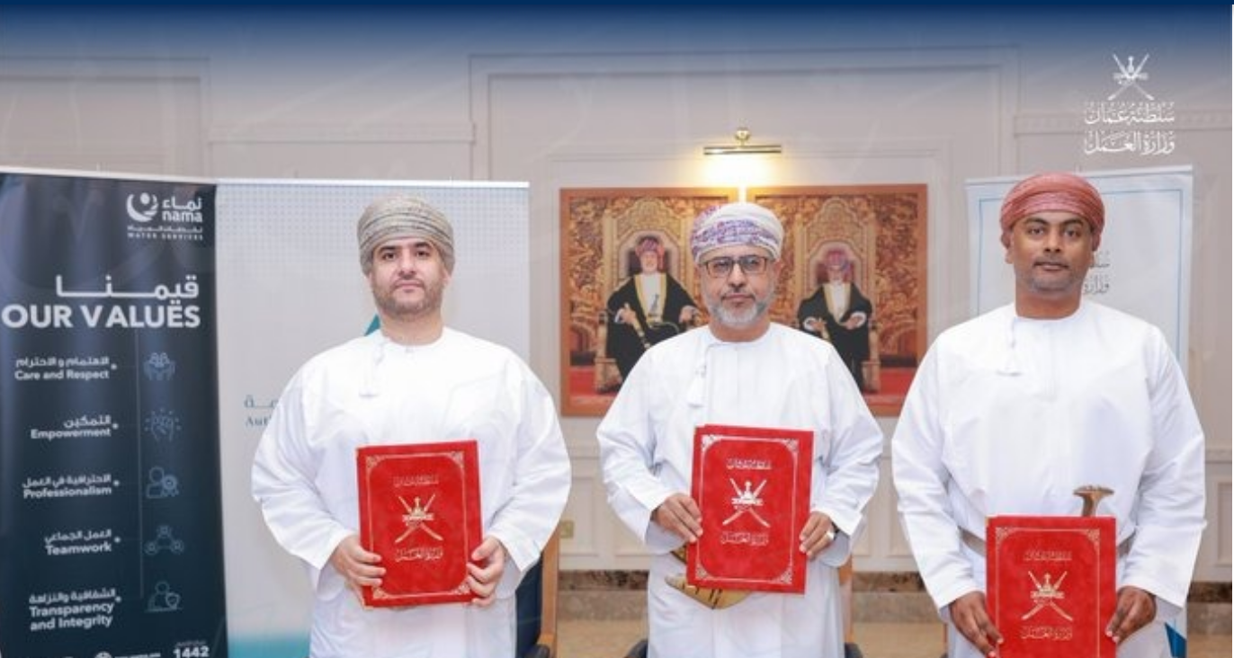 The agreement was signed by His Excellency Sayyid Salim bin Musallam Al Busaidi, Undersecretary of the Ministry of Labour for Human Resources Development, with Qais bin Saud Al Zakwani, CEO of Nama Water Services, and His Excellency Dr. Mansour bin Talib bin Ali Al Hinai, Chairman of the Public Services Regulatory Authority.