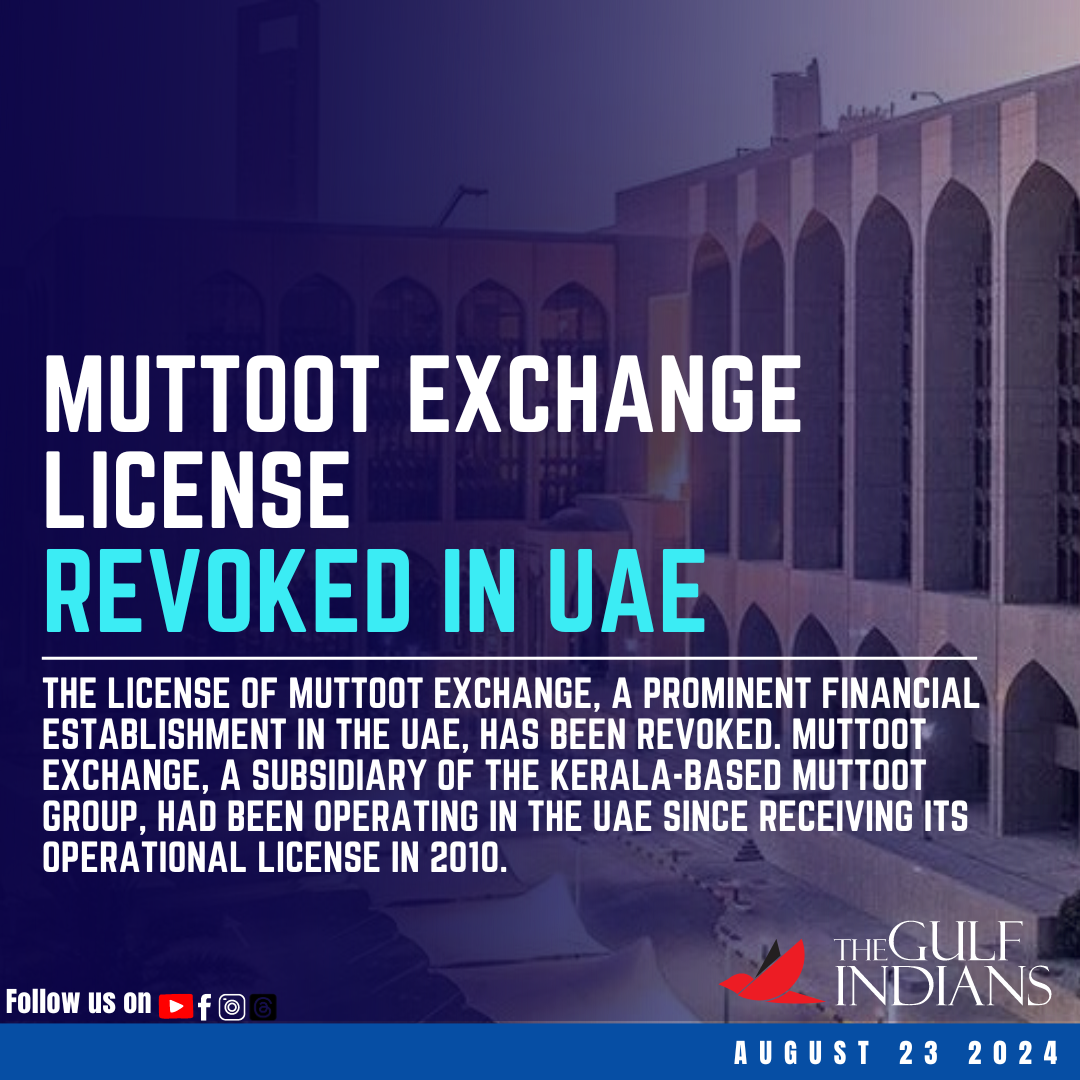 Sharjah: The license of Muttoot Exchange, a prominent financial establishment in the UAE, has been revoked. Muttoot Exchange, a subsidiary of the Kerala-based Muttoot Group, had been operating in the UAE since receiving its operational license in 2010.