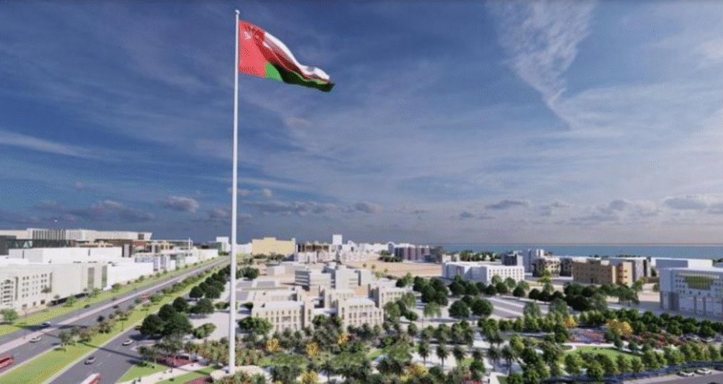Flying proudly at its summit will be a massive Omani flag measuring 18 meters long and 31.5 meters wide. For aviation safety, the flagpole is equipped with a warning light system for aircraft.