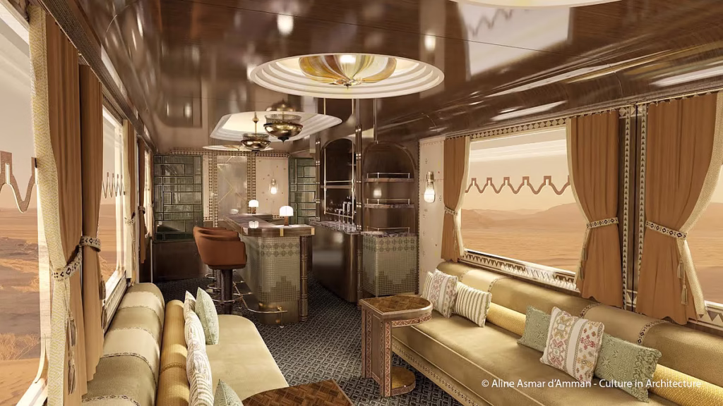 The train is designed by architect and interior designer Aline Asmar d’Amman and her studio Culture in Architecture, reflecting a harmonious fusion of modern elegance and Saudi heritage.